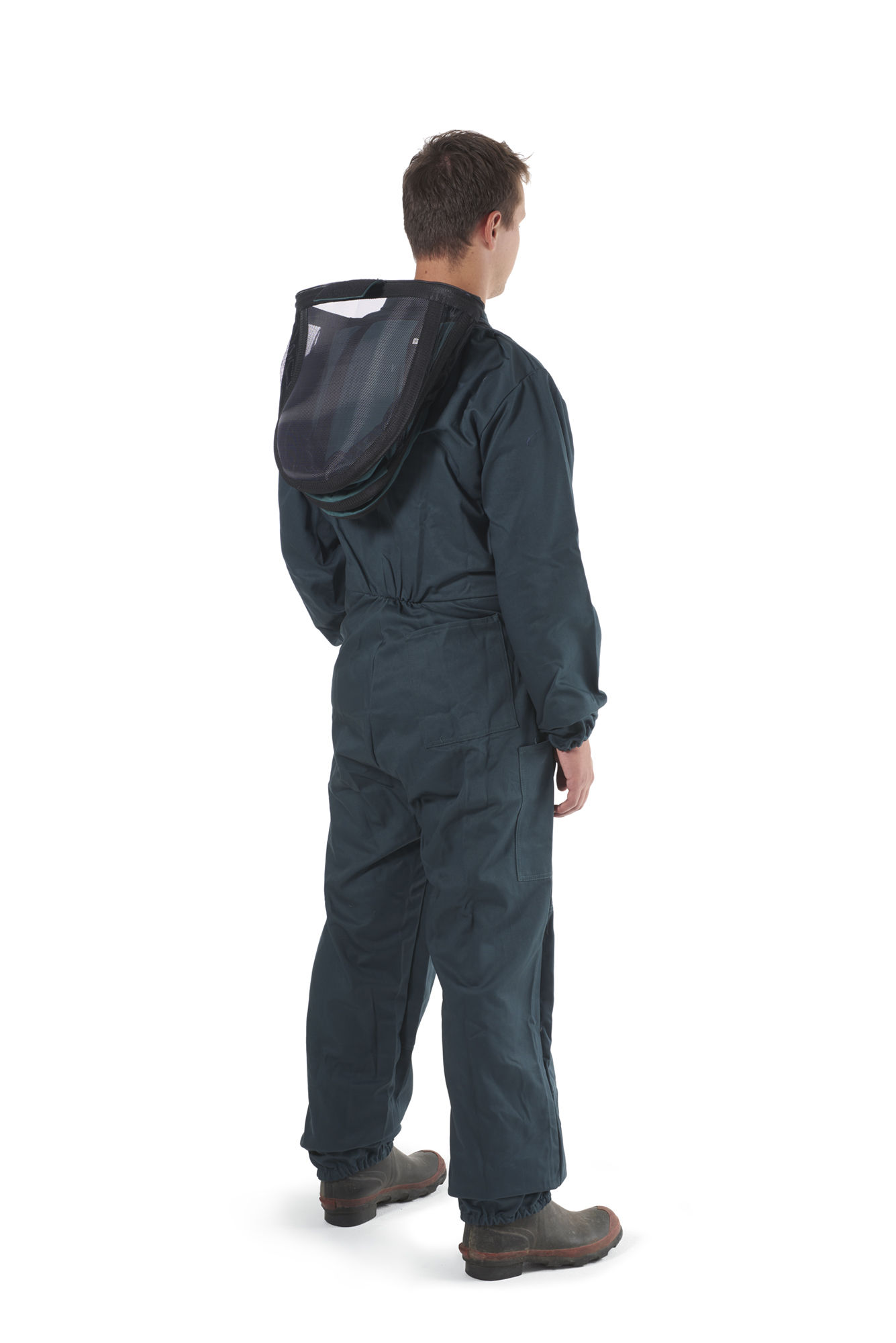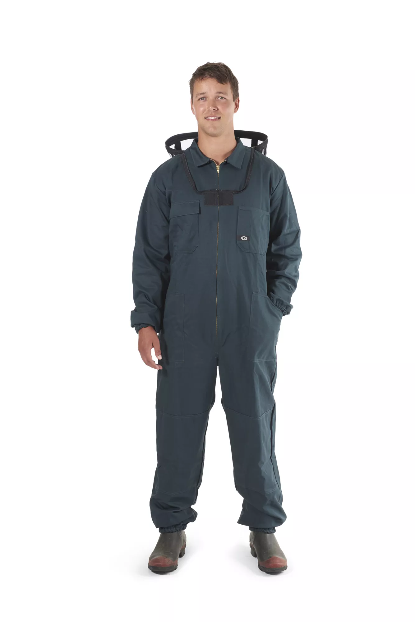 - NZ made 310gsm 100% woven cotton drill overall which includes - additional length & elastic in arms & legs, extended brass zip & double fabric on knees, supplied complete with a folding hood which is attached by zips at the neck